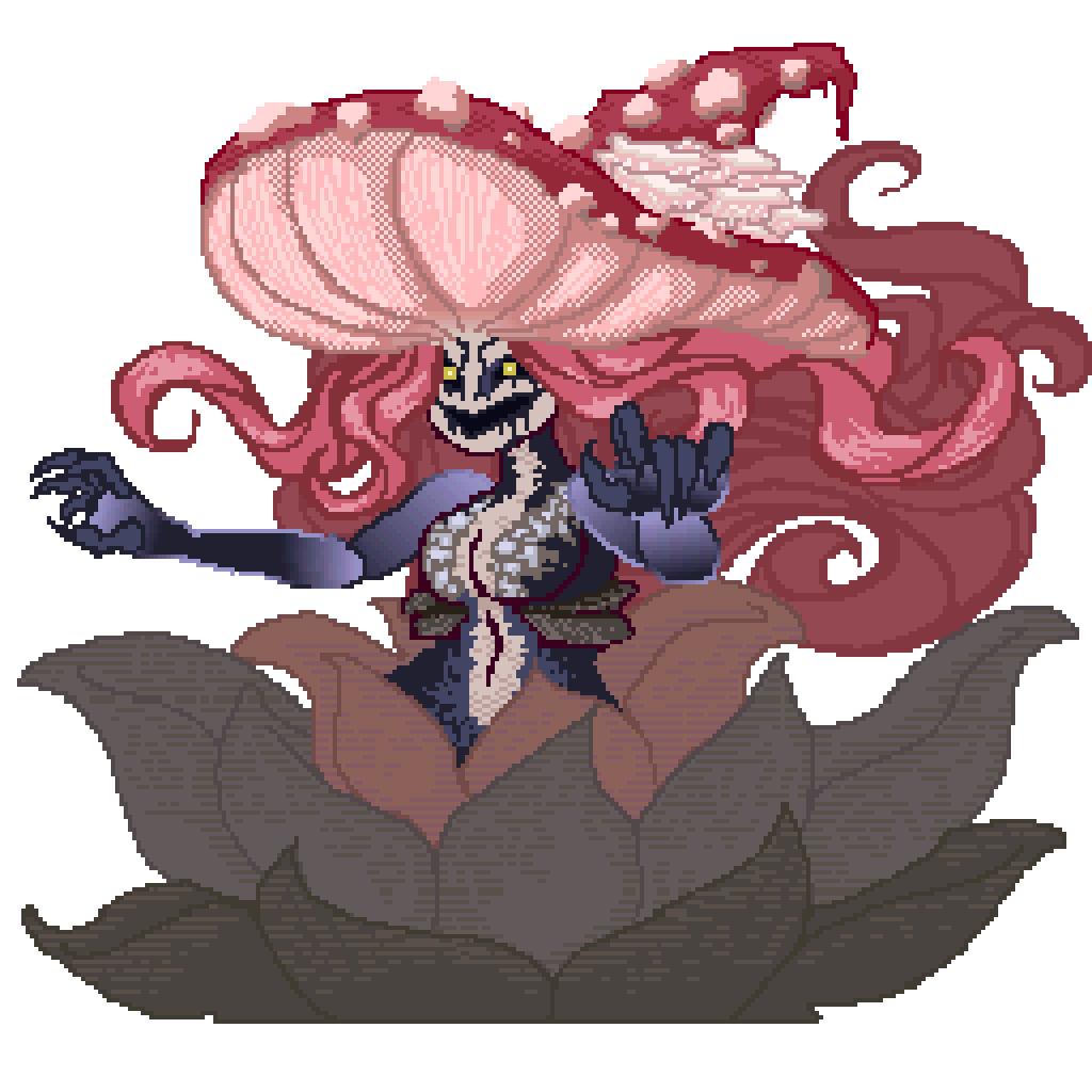 My designs for the mysterious mushroom fairy, Galerina. Her actual intentions at the initial start of the game are meant to be unknown until the very end. She helps Sybil throughout the game until her true goals are revealed just before you fight her, as the game's final boss!